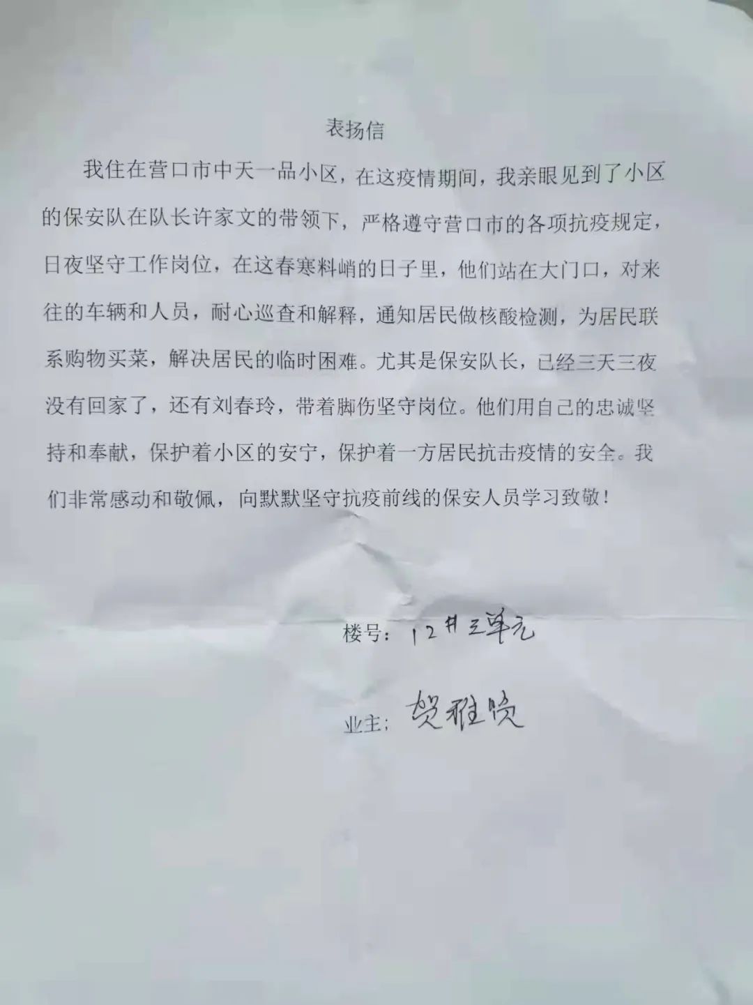 這三天里,物業(yè)人也經(jīng)受了太多的委屈和抱怨。因為疫情封閉,禁止人員外出,部分業(yè)主不理解,把不滿和怨氣都撒在保安的身上,有的爭吵謾罵,有的甚至還動手。他們每天都要不停地解釋,承受著各種指責(zé)和辱罵,但他們不退縮,以良好的品質(zhì),堅守在自己的崗位上,盡心盡力做好工作。