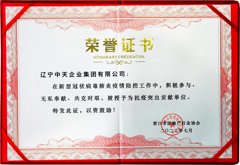 日前,營口房地產(chǎn)行業(yè)協(xié)會授予中天集團(tuán)“在新型冠狀病毒肺炎疫情、攻克時艱,為抗疫突出貢獻(xiàn)單位”稱號,頒發(fā)榮譽(yù)證書和紀(jì)念牌匾,防控工作中,積極參與、無私奉獻(xiàn)表獎中天集團(tuán)所作出的貢獻(xiàn)。今年疫情發(fā)生以來,集團(tuán)特別捐贈50萬元,并多次向社區(qū)一線送去慰問物質(zhì),同時,集團(tuán)所屬各物業(yè)各小區(qū)、中天酒店、中天農(nóng)貿(mào)市場等全方位為抗疫保障服務(wù),充分發(fā)揮了一個企業(yè)的擔(dān)當(dāng)作用,為全社會抗擊疫情做出了貢獻(xiàn)。