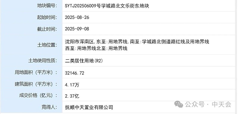 2025年9月8日,遼寧中天企業(yè)集團旗下?lián)犴樦刑熘脴I(yè)有限公司以2.37億成功斬獲備受矚目的沈陽市渾南區(qū)核心板塊長青學城路北、文樂街東地塊,標志著中天集團成功進軍沈陽市,進一步實現(xiàn)布局遼寧的戰(zhàn)略構(gòu)想,企業(yè)戰(zhàn)略發(fā)展版圖再擴張。