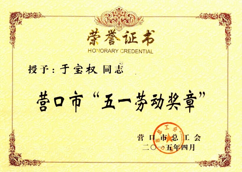 在五一國際勞動節(jié)來臨之際, 4月28日上午,市總工會召開的2015年營口市“五一勞動獎狀”和“五一勞動獎?wù)隆北碚么髸?,于寶?quán)董事長榮獲“市五一勞動獎?wù)隆笔鈽s;4月29日上午,在站前區(qū)政府召開的“站前區(qū)勞動模范先進集體表彰會”上,于洪濤總經(jīng)理榮獲“站前區(qū)勞動模范”殊榮。所獲得的殊榮是市政府、區(qū)政府對兩位領(lǐng)導(dǎo)者多年來兢兢業(yè)業(yè)工作、不斷奉獻社會的稱贊;也是對我們中天集團十四載風雨兼程,穩(wěn)健發(fā)展的充分肯定。