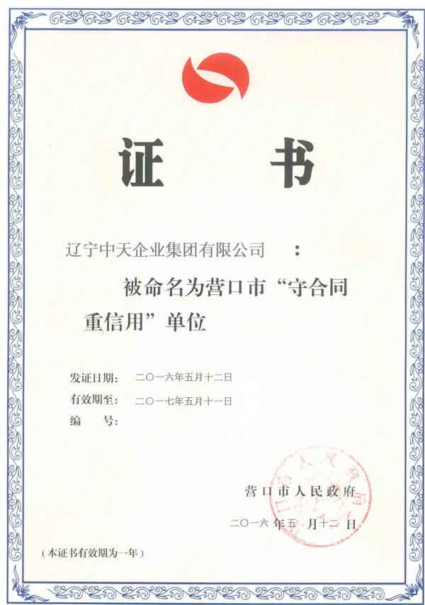 10、集團連續(xù)12載榮獲“守合同重信用”單位稱號。2016年中天集團再次被營口市人民政府授予“守合同重信用”單位稱號,連續(xù)12年獲此殊榮,不僅是全體員工多年勤奮工作、共同努力的結(jié)果,更是集團恪守誠信、規(guī)范經(jīng)營的有力印證,也是對中天優(yōu)秀品牌信譽建設(shè)成果的充分肯定。
